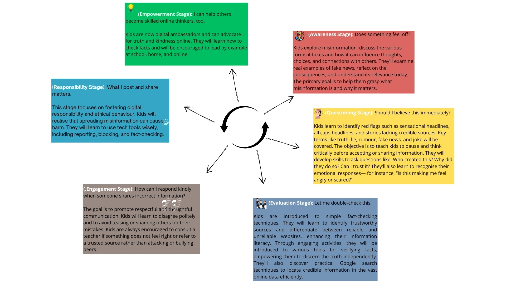 The Fact Forwards program takes a holistic approach to combating misinformation. It is designed to guide young learners from basic awareness to becoming critical thinkers who can responsibly identify and address misinformation. Each stage of the program builds on the previous one, helping students progress from simply recognising misinformation to confidently and ethically challenging it as they mature.